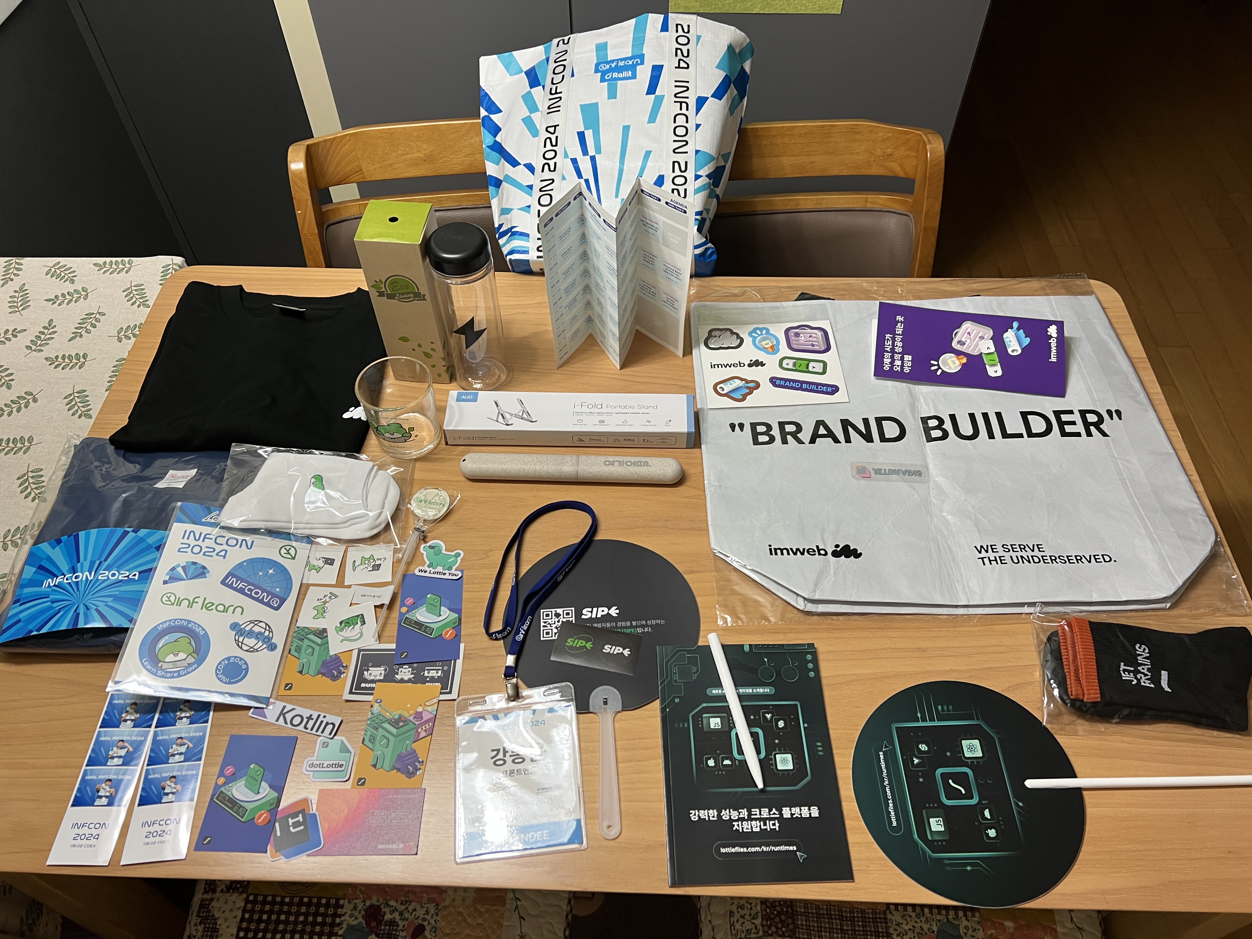 한 보따리 싸들고 집으로 돌아와서 다 풀어보니 정말 많은 굿즈들을 받았었다 ㅎㅎ 티켓 값이 22,000원이었는데 그 이상의 굿즈들, 지식 공유들을 받아왔다. 기회가 된다면 정말 꼭 2025년 인프콘도 참여하고 싶다. 그리고 훗날 인프콘의 스피커로서 컨퍼런스를 참여해보고 싶다...!! 너무나 감사하고 즐거웠던 시간이었습니다~